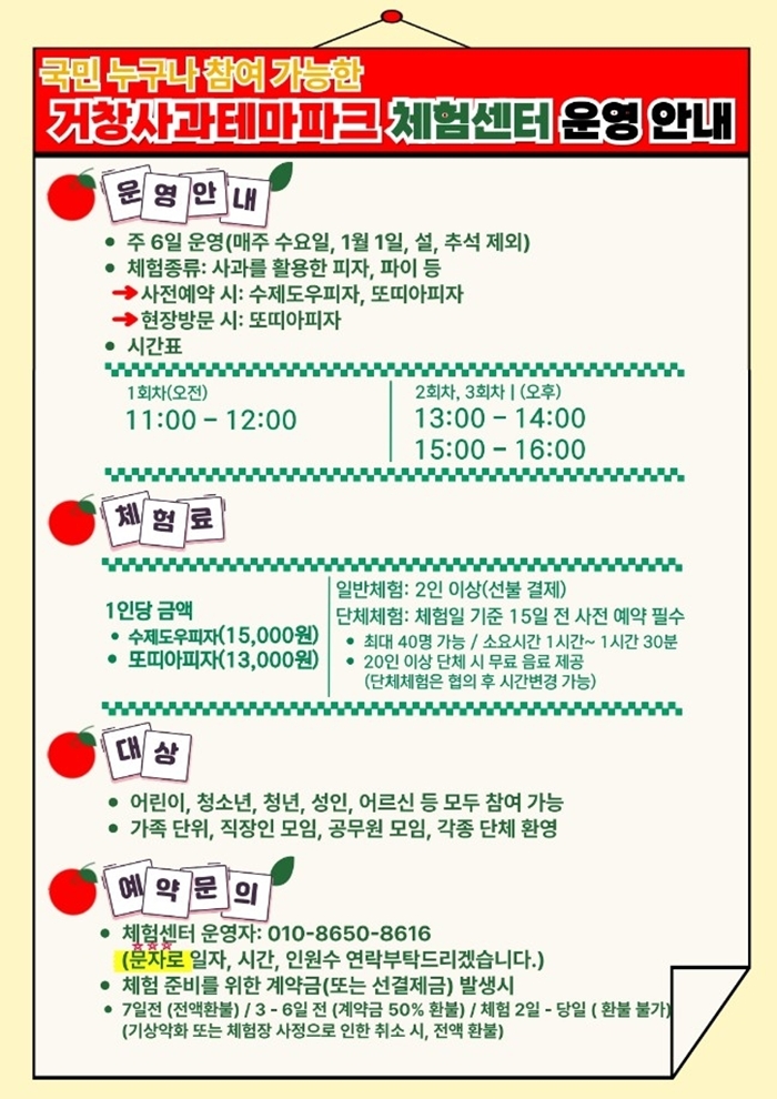»ç°ú ÀÌ¿ëüÇè¼¾ÅÍ´Â °Åâ »ç°ú¸¦ ÁÖÀç·á·Î ÇÑ ´Ù¾çÇÑ ¿ä¸® üÇèÀ» ÅëÇØ Áö¿ª ³ó»ê¹°ÀÇ ºÎ°¡°¡Ä¡¸¦ ³ôÀÌ°í ¼Òºñ¸¦ ÃËÁøÇÏ´Â º¹ÇÕ Ã¼Çè°ø°£À¸·Î, ¿ÃÇØ 1¿ùºÎÅÍ °øÀ¯Àç»ê »ç¿ë·¼öÀÍÇã°¡¸¦ ÅëÇØ ¹Î°£¾÷ü Å丣Ÿ°¡ ¿î¿µÇϰí ÀÖÀ¸¸ç, üÇèÇÁ·Î±×·¥Àº ¿î¿µ °èȹ¿¡ µû¶ó ÁøÇàµÇ°í ÀÖ´Ù.