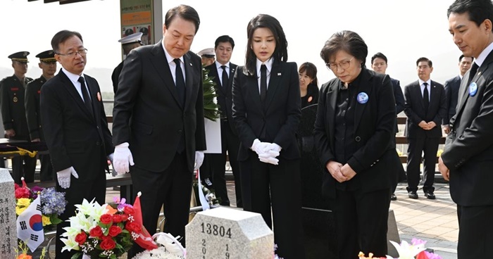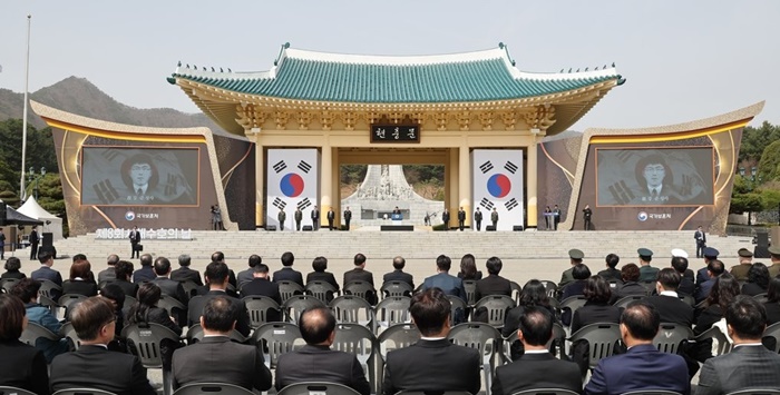 | À±¼®¿ ´ëÅë·ÉÀÌ 24ÀÏ ´ëÀü À¯¼º±¸ ±¹¸³´ëÀüÇöÃæ¿ø¿¡¼ ¿¸° Á¦8ȸ ¼ÇؼöÈ£ÀÇ ³¯ ±â³ä½Ä¿¡¼ Èñ»ýÀÚÀÇ À̸§À» ºÎ¸£°í ÀÖ´Ù. /´ëÅë·É½Ç Á¦°ø. |