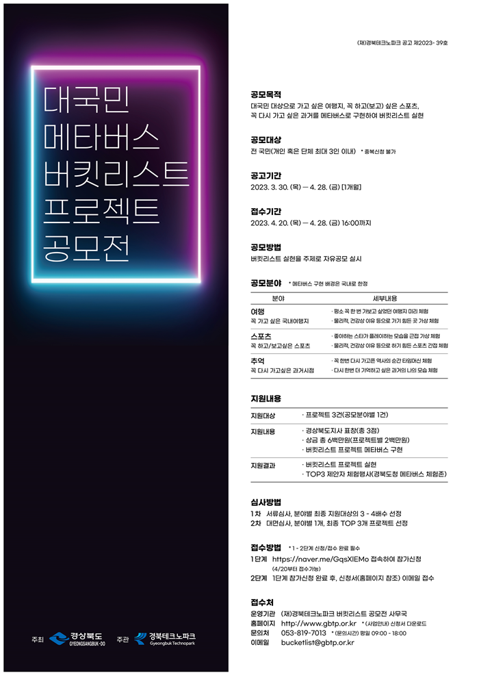 À̹ø °ø¸ðÀüÀº '¸ÞŸ°æºÏ ¾ó¶óÀ̾𽺠ÇÁ·ÎÁ§Æ®±×·ì ¿î¿µ Áö¿ø»ç¾÷' Áß ÁöÁ¤°úÁ¦·Î ÃßÁøÇÏ´Â »ç¾÷À¸·Î ¡â°¡°í ½ÍÀº ¿©ÇàÁö ¡â²À ÇÏ°í ½ÍÀº ½ºÆ÷Ã÷ ¡â²À ´Ù½Ã °¡°í ½ÍÀº °ú°Å µî 3°³ ºÐ¾ß·Î ÁøÇàµÈ´Ù.