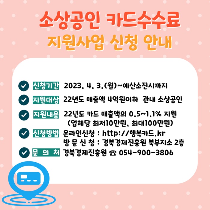 ½Åû±â°£Àº 4¿ù 3ÀϺÎÅÍ 11¿ù 30ÀϱîÁöÀ̸ç, ¿¹»ê ¼ÒÁø ½Ã Á¶±â Á¾·áµÉ ¼ö ÀÖ´Ù. Áö¿ø´ë»óÀº 2022³â ¸ÅÃâ¾× 4¾ï ¿ø ÀÌÇÏ °ü³» ¼Ò»ó°øÀÎÀ̸ç, 2022³â Ä«µå¸ÅÃâ¾×ÀÇ 0.5~1.1%ÀÌ Áö¿øµÇ°í, ¾÷ü´ç ÃÖÀú 10¸¸ ¿ø, ÃÖ´ë 100¸¸ ¿ø±îÁö Áö¿øµÈ´Ù.