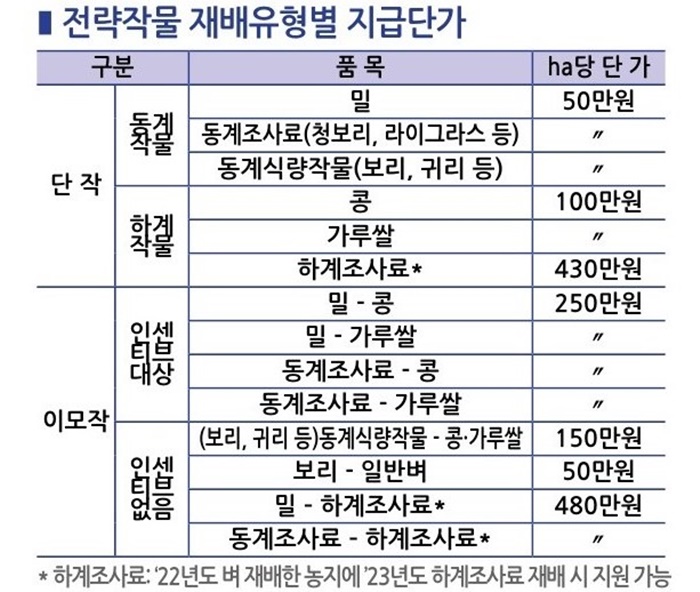 ¿ÃÇØºÎÅÍ ½ÃÇàÁßÀÎ ‘Àü·«Á÷ºÒ±Ý’Àº ½Ä·®ÀÚ±Þ·ü Á¦°í, ½Ò ¼ö±Þ¾ÈÁ¤, ³í ÀÌ¿ë·ü Á¦°í¿Í ³ó¾÷ÀÎÀÇ ¼Òµæ¾ÈÁ¤ µµ¸ð¸¦ À§ÇØ ±âÁ¸ ³í Ȱ¿ë Á÷ºÒ(³í À̸ðÀÛ) ´ë»ó ÀÛ¹°ÀÎ µ¿°èÀÛ¹°À̳ª Çϰè ÀÛ¹°À» Àç¹èÇÒ ¶§ Á÷ºÒ±ÝÀ¸·Î ³ó¾÷ÀÎÀ» Áö¿øÇÏ´Â »ç¾÷ÀÌ´Ù.
