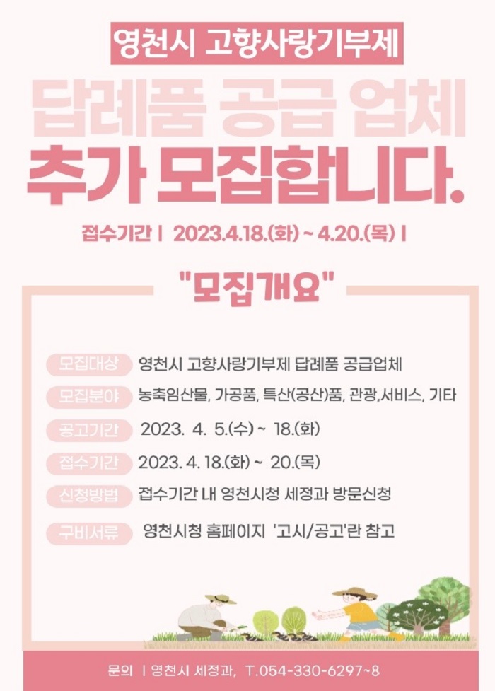 °ø±Þ¾÷ü ¸ðÁý ´ë»óÀº ¿µÃµ½Ã¿¡ »ç¾÷ÀåÀ» µÎ°í, ¼±Á¤µÈ ǰ¸ñÀ» »ý»ê·°¡°ø·Á¦ÀÛÇØ °ø±ÞÇÒ ¼ö ÀÖ´Â ¾÷ü·Î ´ä·Êǰ °ø±ÞÀ» ¿øÇÏ´Â ¾÷ü´Â Á¢¼ö±â°£(4¿ù 18ÀÏ~20ÀÏ) ³» ¿µÃµ½Ãû ¼¼Á¤°ú¸¦ ¹æ¹®ÇØ ½Åû¼·ù¸¦ Á¦ÃâÇØ¾ß Çϸç, ÀÚ¼¼ÇÑ °ø°í ³»¿ëÀº ¿µÃµ½Ã ȨÆäÀÌÁö ‘°í½Ã/°ø°í’ °Ô½ÃÆÇ¿¡¼ È®ÀÎÇÒ ¼ö ÀÖ´Ù.