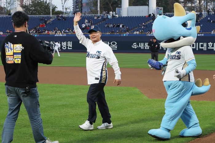 | È«³²Ç¥ â¿øÆ¯·Ê½ÃÀåÀÌ NC´ÙÀ̳뽺 Ȩ °³¸·Àü ½Ã±¸¸¦ ¸¶Ä£ µÚ ¾ß±¸ÆÒµé¿¡°Ô ¼ÕÀ» µé¾î ÀλçÇϰí ÀÖ´Ù. |