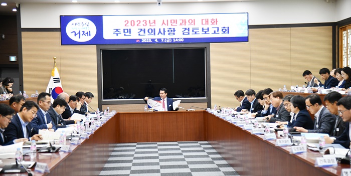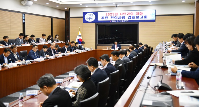 [½Ã»çÄÚ¸®¾ÆÀú³Î=Á¤Á¾¹Î ¼±ÀÓ±âÀÚ] °ÅÁ¦½Ã(½ÃÀå ¹ÚÁ¾¿ì)´Â 7ÀÏ ½Ãû ÁßȸÀǽǿ¡¼ ¹ÚÁ¾¿ì ½ÃÀå ÁÖÀç·Î ±¹‧¼ÒÀå ¹× °ü·Ã ºÎ¼ÀåÀ» ºñ·ÔÇÑ 18°³ ¸éµ¿ÀåÀÌ Âü¼®ÇÑ °¡¿îµ¥ '2023³â ½Ã¹Î°úÀÇ ´ëÈ ÁֹΠ°ÇÀÇ»çÇ× °ËÅ亸°íȸ'¸¦ °¡Á³´Ù.