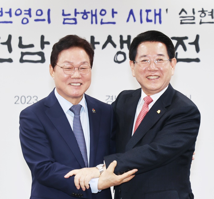 | ¹Ú¿Ï¼ö °æ³²µµÁö»ç(¿ÞÂÊ)¿Í ±è¿µ·Ï Àü³²µµÁö»ç°¡ ‘°æ³²-Àü³² »ó»ý¹ßÀü Çù¾à½Ä’À» °®°í Çù¾à¼¸¦ µé¾îº¸À̰í ÀÖ´Ù. |