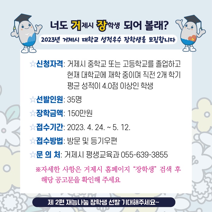 [½Ã»çÄÚ¸®¾ÆÀú³Î=Á¤Á¾¹Î ¼±ÀÓ±âÀÚ] °ÅÁ¦½Ã(½ÃÀå ¹ÚÁ¾¿ì)´Â ¿À´Â 24ÀϺÎÅÍ 5¿ù 12ÀϱîÁö 2023³âµµ ´ëÇб³ ¼ºÀû¿ì¼ö ÀåÇлýÀ» ¸ðÁýÇÑ´Ù.