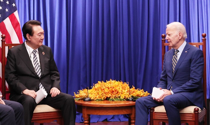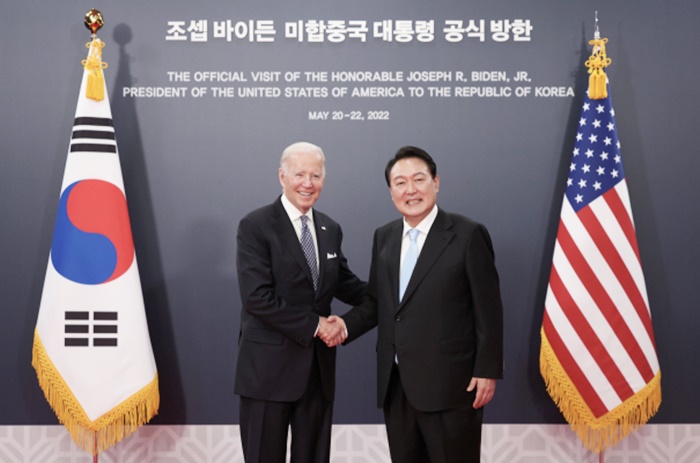 | À±¼®¿ ´ëÅë·É°ú Á¶ ¹ÙÀÌµç ¹Ì±¹ ´ëÅë·ÉÀÌ Áö³ÇØ 5¿ù 21ÀÏ ¼¿ï ¿ë»ê ´ëÅë·É½Ç û»ç¿¡¼ ¾Ç¼öÇÏ¸ç ±â³ä ÃÔ¿µÀ» Çϰí ÀÖ´Ù. /»çÁøÁ¦°ø=´ëÅë·É½Ç |