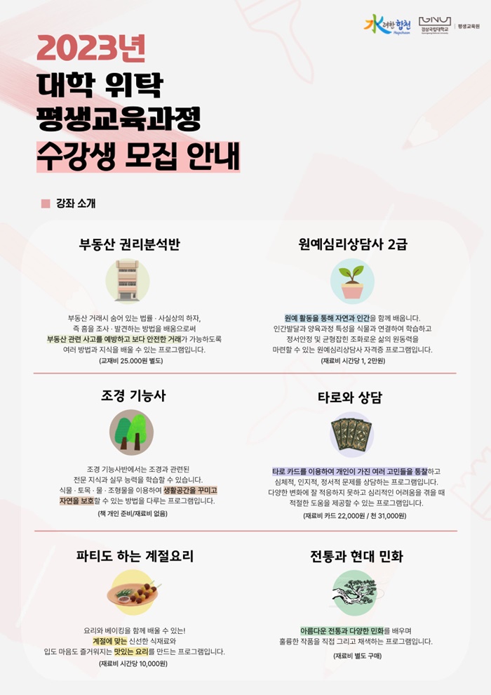 À̹ø °úÁ¤Àº °æ»ó±¹¸³´ë Æò»ý±³À°¿ø À§Å¹°úÁ¤À¸·Î ºÎµ¿»ê±Ç¸®ºÐ¼®¹Ý, ¿ø¿¹½É¸®»ó´ã»ç2±Þ, Á¶°æ±â´É»ç Àü¹®±³À°°úÁ¤ 3°³ °ÁÂ¿Í Å¸·Î¿Í »ó´ã, ÆÄƼµµ ÇÏ´Â °èÀý¿ä¸®, ÀüÅë ¹ÎÈ µî Ãë¹Ì»ýȰ¹Ý 3°³ °Á·ΠÀÌ·ïÁ® ÀÖÀ¸¸ç ±º¹ÎµéÀÇ ´Ù¾çÇÑ Æò»ýÇнÀ ¿å±¸¿¡ ºÎÀÀÇϴ ü°èÀûÀ̰í Àü¹®ÀûÀÎ °úÁ¤À» °³¼³ÇÒ ¿¹Á¤ÀÌ´Ù.