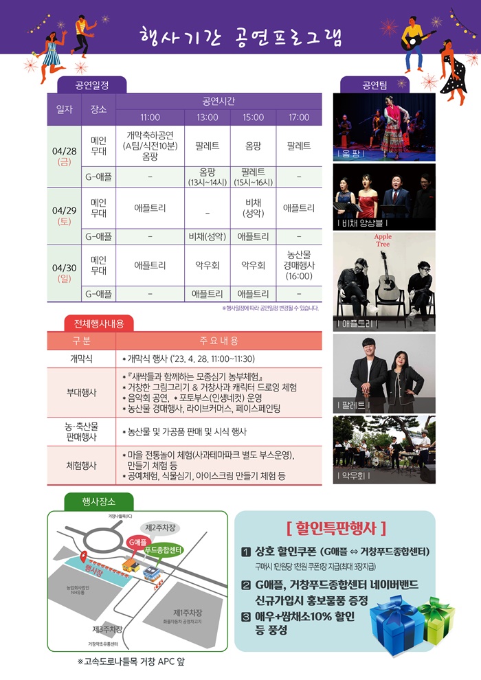 ¶ÇÇÑ, Çà»ç ±â°£ ³ó»ê¹° ÆÇ¸ÅÃËÁøÀ» À§ÇØ ¸¹Àº ¾÷ü°¡ Âü°¡ÇØ ³ó·Æ¯»ê¹°À» ÆÇ¸ÅÇÏ°í ½Ã½Ä À̺¥Æ®¸¦ ÁøÇàÇÒ ¿¹Á¤À̸ç, ¸ÞÀι«´ë¿Í G-¾ÖÇà ¸ÅÀå ³»¿¡¼ º½ÀÇ Çâ±â¸¦ ´À³¥ ¼ö ÀÖ´Â ´Ù¾çÇÑ °ø¿¬µµ ¼±º¸ÀδÙ.