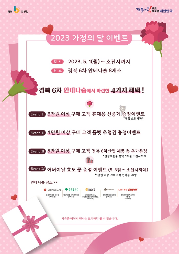 À̹ø Çà»ç´Â °¡Á¤ÀÇ ´ÞÀ» ¸ÂÀÌÇØ °¡Á·, Ä£±¸, µ¿·á µî ÁÖº¯ÀÇ ¼ÒÁßÇÑ À̵鿡°Ô °í¸¶¿ò°ú »ç¶ûÇÏ´Â ¸¶À½À» ÀüÇϰí, ÃÖ±Ù °í¹°°¡ »óȲÀÌ Áö¼ÓµÊ¿¡ µû¶ó ¾î·Á¿òÀ» °Þ°í ÀÖ´Â ¼ÒºñÀڵ鿡°Ô µµ³»¿¡¼ »ý»êµÈ ¿ì¼öÇÑ 6Â÷»ê¾÷ Á¦Ç°µéÀ» Àú·ÅÇÑ °¡°Ý¿¡ ±¸ÀÔÇÒ ¼ö ÀÖ´Â ±âȸ¸¦ Á¦°øÇÔÀ¸·Î½á °æºÏ ³óƯ»êǰÀÇ ÆÇ¸Å°¡ Ȱ¼ºÈµÉ °ÍÀ¸·Î ±â´ëµÈ´Ù.