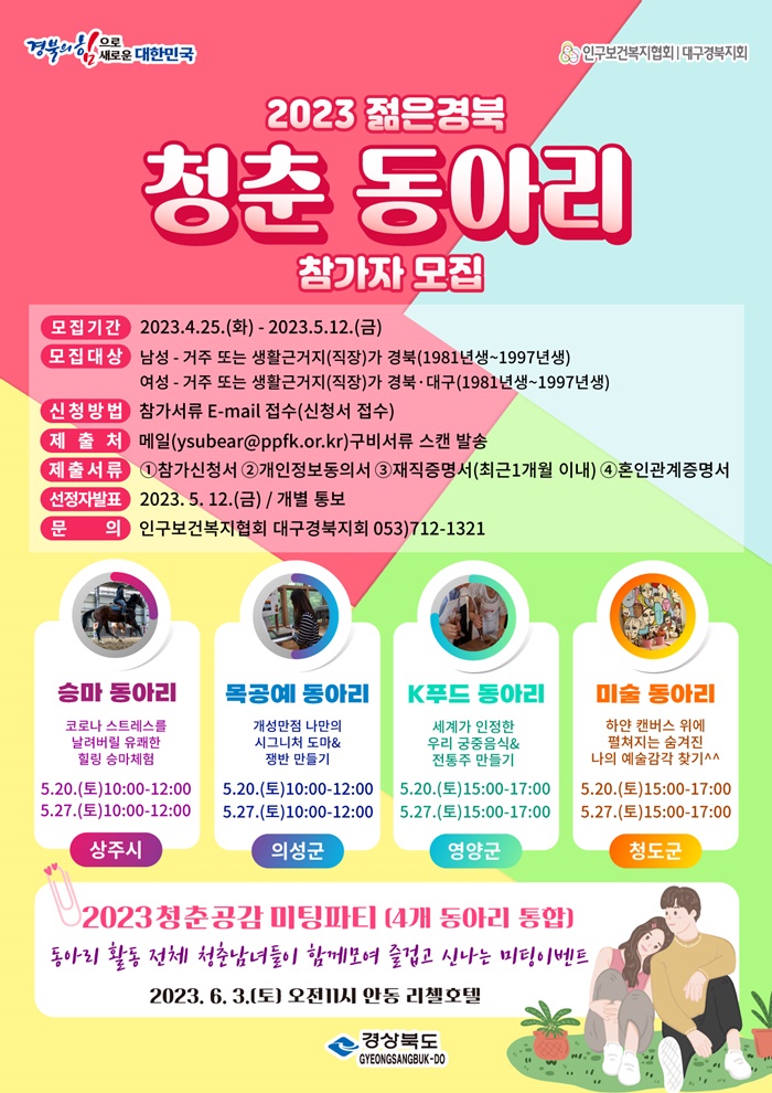 À̹ø 1ȸÂ÷ ûÃᵿ¾Æ¸® Ȱµ¿»ç¾÷Àº °áÈ¥Àû·É±â ¹ÌÈ¥ ³²³à¸¦ ´ë»óÀ¸·Î ´ÙÀ½´Þ 20ÀÏ, 27ÀÏ ÀÌÆ²°£ ÃÑ 4°³ Ŭ·¡½º(»óÁÖ-½Â¸¶, ÀǼº-¸ñ°ø¿¹, ¿µ¾ç-¿ä¸®, ûµµ-¹Ì¼ú)·Î ÁøÇàµÇ¸ç, °¢ Ŭ·¡½º ´ç 10~18¸íÀÇ ÀοøÀ» ¹èÁ¤ÇØ Ãë¹ÌȰµ¿ °øÀ¯¸¦ ÅëÇÑ ³»½Ç ÀÖ´Â µ¿¾Æ¸® Ȱµ¿À¸·Î ÃßÁøµÈ´Ù.