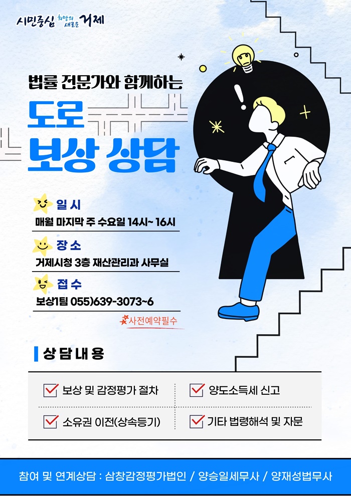 ½Ã´Â ¹ý·ü Àü¹®°¡¿ÍÀÇ »ó´ãÀ» ÅëÇØ µµ·Î º¸»ó¿¡ ´ëÇÑ ½Ã¹ÎµéÀÇ ÀÌÇØµµ¿Í ½Å·Úµµ¸¦ ³ô¿© °øÀÍ»ç¾÷ ÆíÀÔ ÅäÁöÁÖ¿ÍÀÇ ¹Î¿ø°ú ºÐÀïÀ» ¿¹¹æÇϰí, Á¤È®ÇÑ Á¤º¸¸¦ Á¦°øÇØ µµ½Ã°èȹ ½Å¼Ó ÃßÁøÀÇ ±â¹ÝÀ» ±¸ÃàÇÑ´Ù´Â °èȹÀÌ´Ù.