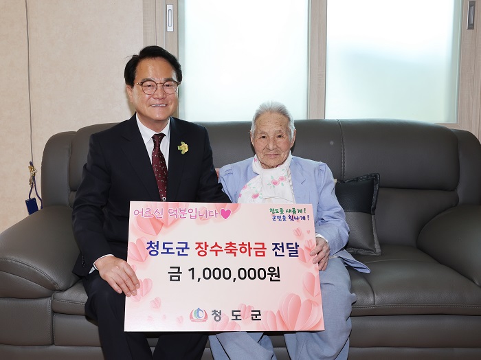 [½Ã»çÄÚ¸®¾ÆÀú³Î=°æºÏÃëÀ纻ºÎ] ûµµ±º(±º¼ö ±èÇϼö)Àº Áö³ 1ÀÏ °ü³» 100¼¼ »ýÀÏÀ» ¸ÂÀ¸½Å ¾î¸£½Å °¡±¸(ûµµÀ¾ ´ö¾Ï2¸®)¸¦ ¹æ¹®ÇØ Àå¼öÃàÇÏ±Ý 100¸¸ ¿ø°ú Àå¼öÁöÆÎÀÌ(û·ÁÀå)¸¦ Àü´ÞÇß´Ù.