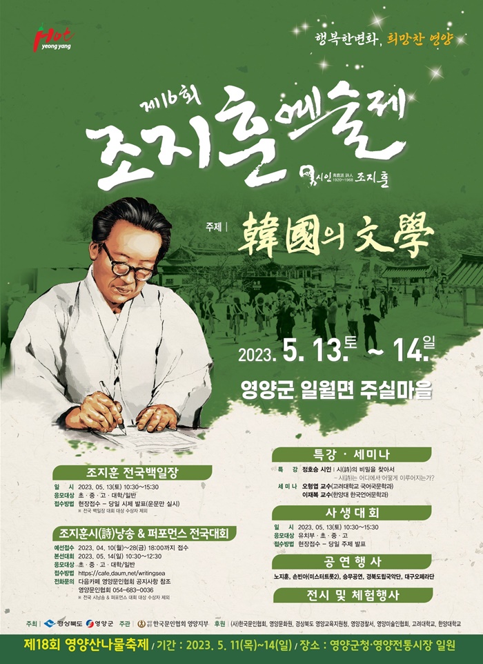 Á¦16ȸ Á¶ÁöÈÆ ¿¹¼úÁ¦´Â ¿µ¾ç±º(±º¼ö ¿ÀµµÃ¢)ÀÌ ÁÖÃÖÇϰí (»ç)Çѱ¹¹®ÀÎÇùȸ ¿µ¾çÁöºÎ(ȸÀå ȲÅÂÁø)ÀÇ ÁÖ°üÀ¸·Î 2007³â ù ȸ¸¦ ½ÃÀÛÀ¸·Î ¿ÃÇØ 16ȸ¸¦ ¸ÂÀÌÇÏ´Â ¿µ¾çÀÇ ´ëÇ¥ÀûÀÎ Á¾ÇÕ¹®È¿¹¼úÇà»ç´Ù.