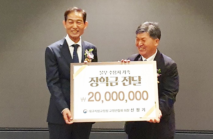 | ´ë±¸Áö¹æ±³Á¤Ã» ±³Á¤¿¬ÇÕȸ Á¤±âÃÑȸ ¹× ȸÀå´Ü ÀÌ · ÃëÀÓ½ÄÀÌ 25ÀÏ ´ë±¸±×·£µåÈ£ÅÚ¿¡¼ ¿·È´Ù. »çÁøÀº ½ÅÀÓ ½ÅÁ¤±â ȸÀå(¿ÞÂÊ)ÀÌ ¿ìÈñ°æ ´ë±¸Áö¹æ±³Á¤Ã»Àå¿¡°Ô ºÒ¿ì¼ö¿ëÀÚ °¡Á·À» À§ÇÑ ÀåÇбÝÀ» Àü´ÞÇϰí ÀÖ´Ù. |