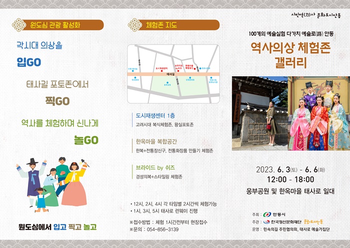 ¿ª»çÀÇ»óüÇèÀº ¾Èµ¿ ¿øµµ½É ÅÂ»ç±æ ƯȰŸ®¿Í ÇÑ¿Á¸¶À» ÀÏ´ë¿¡¼ 6¿ù 3ÀÏ Åä¿äÀϺÎÅÍ ÇöÃæÀÏÀÎ 6¿ù 6ÀϱîÁö ³ªÈê°£ ÁøÇàµÇ¸ç, ¿ª»çÀÇ»óüÇè »Ó ¾Æ´Ï¶ó, ÀüÅ뽺ŸÀϸµ üÇè, ÀüÅëÈÀåǰ°ú Àå½Å±¸ ¸¸µé±â üÇèµµ ÁغñµÅ ÀÖ´Ù.