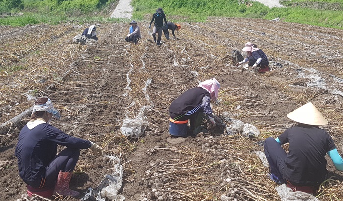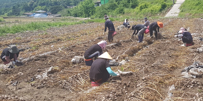 [½Ã»çÄÚ¸®¾ÆÀú³Î=Á¤Á¾¹Î ¼±ÀÓ±âÀÚ] ÇÕõ±º ³ëÀξƵ¿¿©¼º°ú Á÷¿øµéÀº 2ÀÏ ³ó¹ø±â¿¡ ÀæÀº ºñ¿Í Àη³À¸·Î ¸¶´Ã Àû±â ¼öÈ®¿¡ ¾î·Á¿òÀ» °Þ°í ÀÖ´Â ³ó°¡¸¦ À§ÇØ ÀÏ¼Õ µ½±â¿¡ ³ª¼¹´Ù.