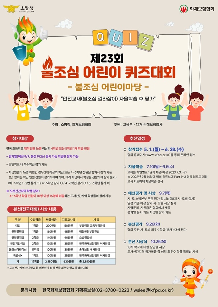 Âü°¡ ´ë»óÀº µµ³» ÃʵîÇб³ 16¸í ÀÌ»óÀÇ 4Çг⠶Ǵ 5Çгâ 1°³ ÇбÞÀÌ´Ù. Âü°¡ ½ÅûÀº 6¿ù 28ÀϱîÁö Çѱ¹ÈÀ纸ÇèÇùȸ ȨÆäÀÌÁö(www.kfpa.or.kr)¸¦ ÅëÇØ ¿Â¶óÀÎ Á¢¼öÇÏ¸é µÈ´Ù.
