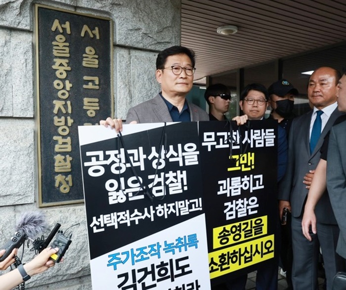 ¼Û Àü ´ëÇ¥´Â ¼¿ïÁß¾ÓÁö°Ë ¾Õ¿¡¼ 'ÁÖ°¡Á¶ÀÛ ³ìÃë·Ï ±è°ÇÈñµµ ¼ÒȯÁ¶»çÇ϶ó', '¹«°íÇÑ »ç¶÷µé ±×¸¸ ±«·ÓÈ÷°í °ËÂûÀº ¼Û¿µ±æÀ» ¼ÒȯÇϽʽÿÀ'¶ó°í ÀûÈù ÇÇÄÏÀ» µé°í 1ÀÎ ½ÃÀ§¿¡ µ¹ÀÔÇß´Ù.