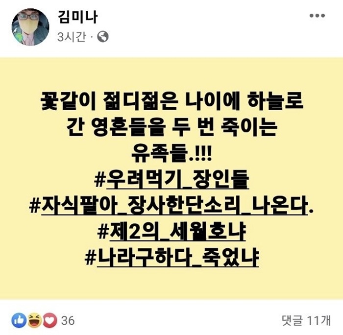 ¹æ¼Û»ç ÀÎÅͺ信 ³ª¿Â ÇÑ À¯Á·ÀÇ ¹ß¾ðÀ» µÎ°íµµ "Áö XX¸¦ µÎ ¹ø Á×ÀÌ´Â ¹«Áö¸ù¸ÅÇÑ XX"¶ó¸ç "ÀÚ½Ä ÆÈ¾Æ ÇÑ ¸ò ì±âÀÚ´Â ¼öÀÛ", "´ç½ÅÀº ±× ½Ã°£ÀÌ ¹«¾ó Ç߱淡 ´©±¸¿¡°Ô Ã¥ÀÓÀ» ¶°³Ñ±â´Â°¡! ÀÚ½Ä ¾Õ¼¼¿î ÁËÀÎÀÌ ¾ç½ÉÀ̶õ °ÍÀÌ Àִ°¡"¶ó°í ¾²±âµµ Çß´Ù.