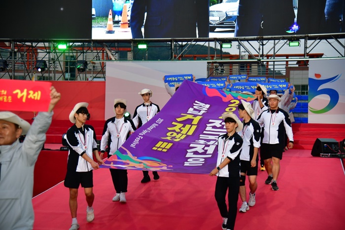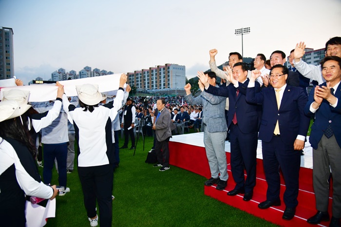 À̳¯ °³È¸½ÄÀº ¹Ú¿Ï¼ö °æ»ó³²µµÁö»ç, µµ³» 18°³ ½ÃÀå · ±º¼ö¸¦ ºñ·ÔÇØ °¢ ½Ã±ºÀ» ´ëÇ¥ÇÏ´Â ¼±¼ö´Ü°ú °ü¶÷°´ µî 5,700¿© ¸íÀÇ µµ¹ÎµéÀÌ Âü¼®ÇÑ °¡¿îµ¥ ÁøÇàµÆ´Ù.