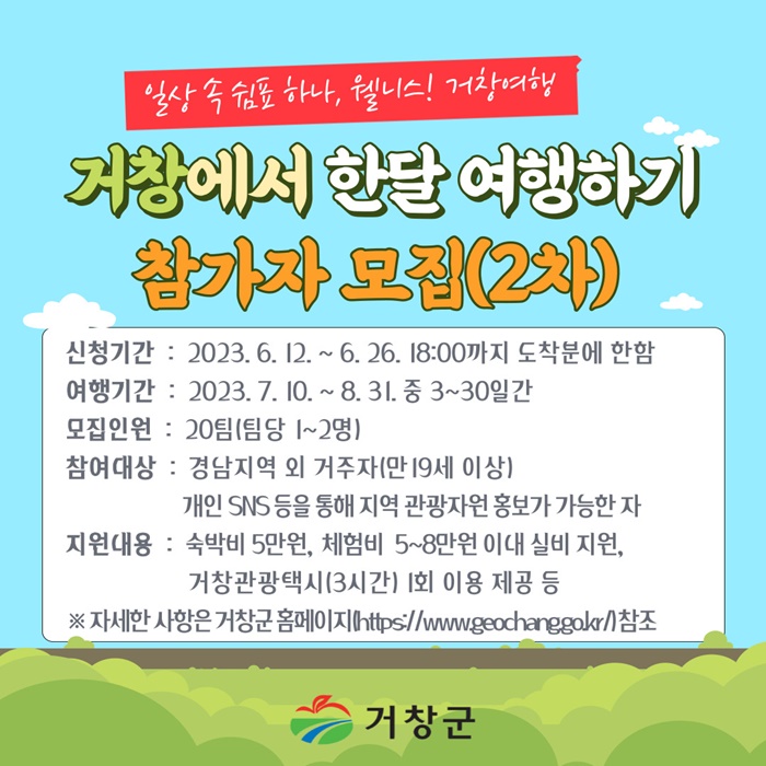 1Â÷ ¸ðÁý°ú °°ÀÌ Âü°¡ ´ë»óÀº ¸¸ 19¼¼ ÀÌ»ó °æ³²Áö¿ª ¿Ü °ÅÁÖÀÚ·Î 1∼2¸íÀÌ ÆÀÀ» ±¸¼ºÇÏ°í °³º° ÀÚÀ¯¿©ÇàÀ» ±âÈ¹ÇØ Âü°¡ ½ÅûÇÒ ¼ö ÀÖÀ¸¸ç, Âü°¡ÀÚ·Î ¼±Á¤µÇ¸é ‘À£´Ï½º! °Åâ¿©Çà’ ¸¸ÀÇ Æ¯º°ÇÑ °æÇèÀ» ÇÒ ¼ö ÀÖ´Ù.