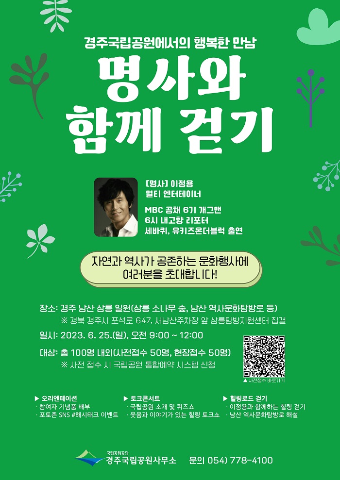 Çà»çÀÇ ÁÖ¿ä ³»¿ëÀº ‘¿ôÀ½°ú À̾߱Ⱑ ÇǾ´Â »ï¸ª ¼Ò³ª¹« ½£ ¼Ó ÅäÅ©ÄܼƮ’, ‘¹è¿ì ÀÌÁ¤¿ë°ú ÇÔ²² °È´Â °æÁÖ±¹¸³°ø¿ø Èú¸µ·Îµå’ À̸ç, Âü°¡½ÅûÀº ±¹¸³°ø¿ø¿¹¾àÅëÇսýºÅÛ(reservation.knps.or.kr)À» ÅëÇÑ »çÀü¿¹¾à°ú Çà»ç ´çÀÏ ÇöÀå¿¡¼ °¡´ÉÇÏ´Ù.