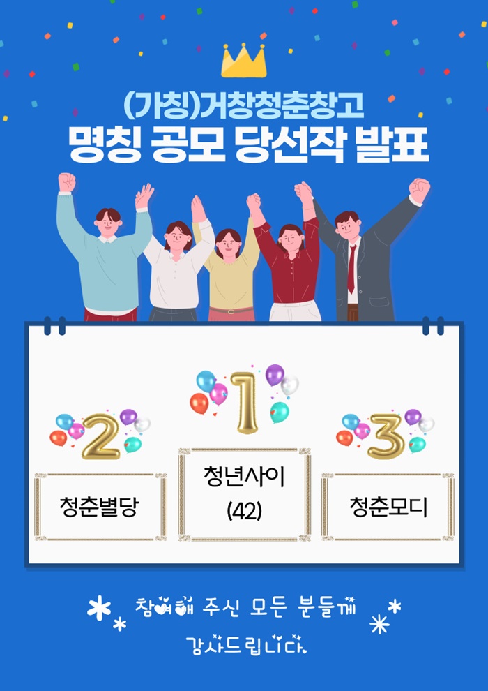 À̹ø ¸íĪÀº Áö³ 5¿ù °ø¸ð¸¦ ÅëÇØ 457°ÇÀÌ Á¢¼öµÅ ¼¸é ½É»ç¿Í ±º¹Î ¼±È£µµ ½É»ç¸¦ °ÅÃÄ ¼±È£µµ°¡ ³ôÀº 5°³ ¸íĪÀ» ¼±Á¤ÇØ °Åⱺ û³âÁ¤Ã¥À§¿øÈ¸ ÃÖÁ¾ ½É»ç¸¦ °ÅÃÄ ‘°Åâû³â»çÀÌ(42)’¸¦ ÃÖ¿ì¼ö ¸íĪÀ¸·Î ¼±Á¤ÇØ Ã»³â °ÅÁ¡ °ø°£ÀÇ »õ À̸§À¸·Î È®Á¤Çß´Ù.