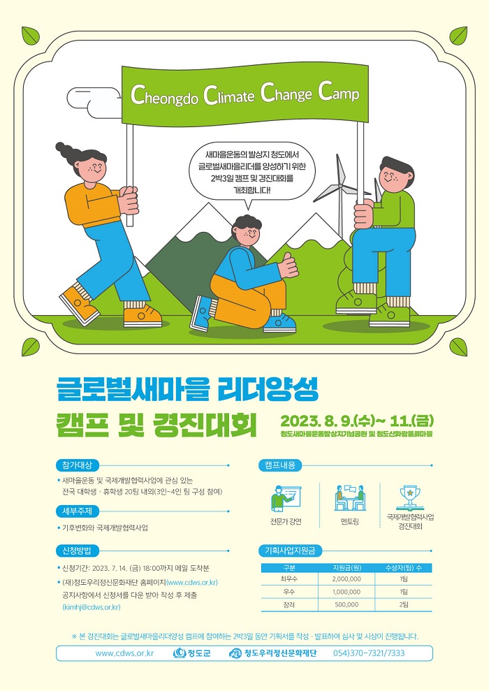 [½Ã»çÄÚ¸®¾ÆÀú³Î=°æºÏÃëÀ纻ºÎ] ûµµ¿ì¸®Á¤½Å¹®ÈÀç´Ü(ÀÌ»çÀå ±èÇϼö ûµµ±º¼ö)Àº ¿À´Â 8¿ù 9ÀϺÎÅÍ 11ÀϱîÁö »õ¸¶À»¿îµ¿¹ß»óÁö±â³ä°ø¿ø°ú ûµµ½Åȶûdz·ù¸¶À»¿¡¼ ÁøÇàµÇ´Â ±Û·Î¹ú »õ¸¶À»¸®´õ ¾ç¼º Ä·ÇÁ ¹× °æÁø´ëȸ Âü°¡ÀÚ¸¦ ¸ðÁýÇÑ´Ù°í ¹àÇû´Ù.
