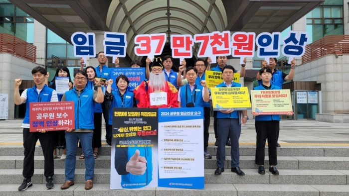 À̳¯ À¯¼º±¸ ³ëÁ¶´Â Á¤ºÎ°¡ Äڷγª19¿Í °í¹°°¡ µîÀÇ ÀÌÀ¯·Î °ø¹«¿ø ³ëµ¿ÀÚ¿¡°Ô ÀϹæÀû Èñ»ýÀ» °¿äÇÑ °ÍÀ» ¹Ý¿µÇØ 2021³âºÎÅÍ 2023³â±îÁöÀÇ ½ÇÁú¼Òµæ °¨¼ÒºÐ ´©ÀûÄ¡¿Í 2024³âµµ ¼ÒºñÀÚ¹°°¡ Àü¸ÁÄ¡¸¦ °í·ÁÇØ ³»³âµµ Àüü °ø¹«¿ø º¸¼ö¸¦ 37¸¸7,000¿ø Á¤¾×À¸·Î ÀλóÇÒ °ÍÀ» ¿ä±¸Çß´Ù.