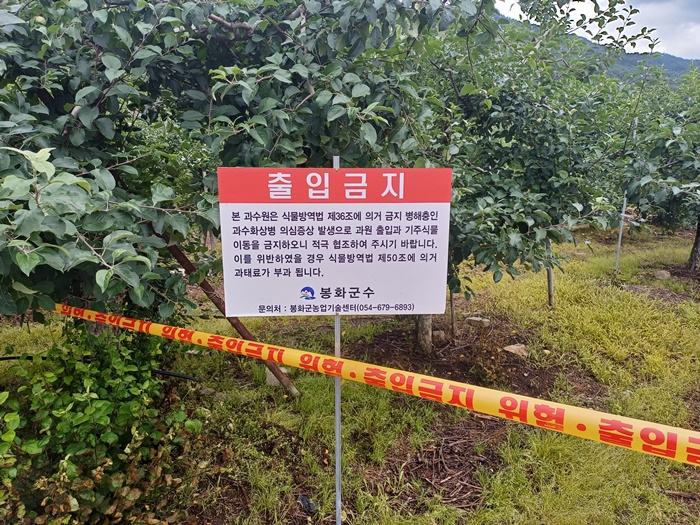 [½Ã»çÄÚ¸®¾ÆÀú³Î=±è¿¬ÇÐ ±âÀÚ] °æ»óºÏµµ³ó¾÷±â¼ú¿øÀº Áö³ 21ÀÏ ºÀȱº Ãá¾ç¸é ¼ÒÀç »ç°ú °ú¼ö¿ø 4°÷(2.74ha)¿¡¼ È»óº´ÀÌ ¹ß»ýÇÔ¿¡ µû¶ó 22~23ÀÏ ÀÌÆ²°£ ¿¹Âû¿ä¿ø 150¸íÀ» ÅõÀÔÇØ ¹ß»ý°ú¿ø ¹Ý°æ 2kmÀ̳» ¸ðµç °ú¿ø(170³ó°¡, 130.2ha)¿¡ ´ëÇÑ Á¤¹Ð¿¹ÂûÀ» ÃßÁøÇÑ´Ù°í ¹àÇû´Ù.