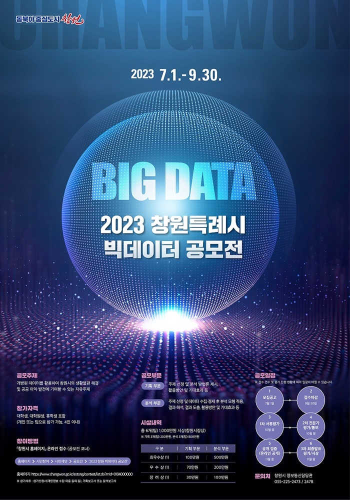°ø¸ðÀü Âü°¡´Â 9¿ù 30ÀϱîÁö ¿Â¶óÀÎ(http://www.changwon.go.kr/sotong)À¸·Î Á¦Ãâ ÇÏ¿©¾ß Çϸç, ÀÚ¼¼ÇÑ ³»¿ëÀº â¿ø½Ã ºòµ¥ÀÌÅÍ Æ÷ÅÐ(http://bigdata.changwon.go.kr)ÀÇ °øÁö»çÇ׿¡¼ ¾È³»¹ÞÀ» ¼ö ÀÖ´Ù.