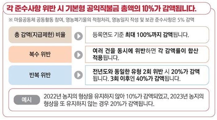 Á¡°Ë°á°ú Áؼö»çÇ× ¹ÌÀÌÇàÀÌ È®ÀÎµÈ ³ó¾÷Àο¡°Ô´Â ÁöÀÚü¿¡ ÇØ´çÁ¤º¸¸¦ ¿¬°èÇÏ¿© Áؼö»çÇ׺°·Î °øÀÍÁ÷ºÒ±Ý ÃѾ×ÀÇ 5~10%¸¦ °¨¾× Áö±ÞÇϸç, °°Àº Áؼö»çÇ×À» Áö³ÇØ¿Í ¿ÃÇØ ¹Ýº¹Çؼ À§¹ÝÇÑ °æ¿ì¿¡´Â °¨¾×·ü 2¹è¸¦ Àû¿ëÇÑ´Ù.