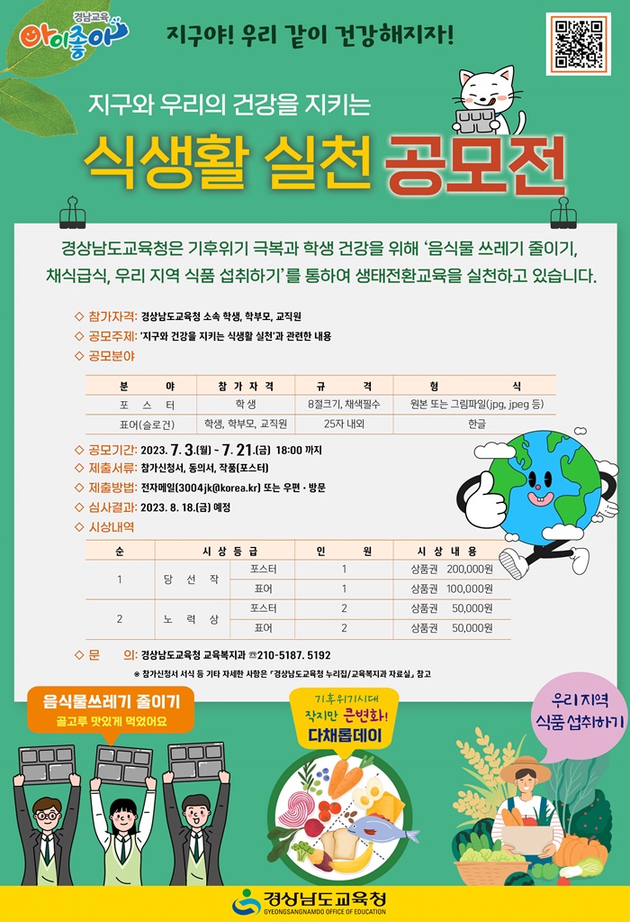 [½Ã»çÄÚ¸®¾ÆÀú³Î=Á¤Á¾¹Î ¼±ÀÓ±âÀÚ] °æ³²µµ±³À°Ã»(±³À°°¨ ¹ÚÁ¾ÈÆ)Àº Çлý, Çкθð, ±³Á÷¿øÀ» ´ë»óÀ¸·Î ‘Áö±¸¿Í °Ç°À» ÁöŰ´Â ½Ä»ýȰ ½Çõ °ø¸ðÀü’À» 3ÀϺÎÅÍ ¿À´Â 21ÀϱîÁö ÁøÇàÇÑ´Ù.