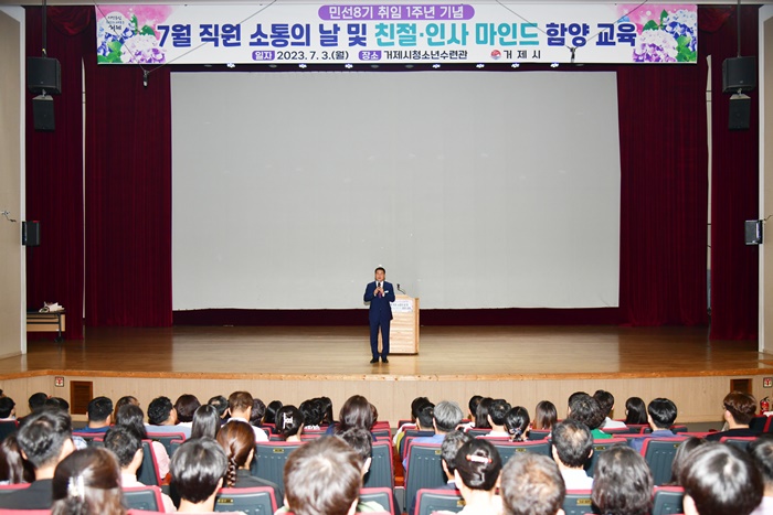 | ¹ÚÁ¾¿ì °ÅÁ¦½ÃÀåÀÌ ¹Î¼±8±â ÃëÀÓ 1ÁÖ³âÀ» ¸Â¾Æ 2³âÂ÷ ù³¯ °ÅÁ¦½Ãû¼Ò³â¼ö·Ã°ü¿¡¼ Á÷¿øµé°ú ¼ÒÅëÀÇ ½Ã°£À» °¡Á³´Ù. |