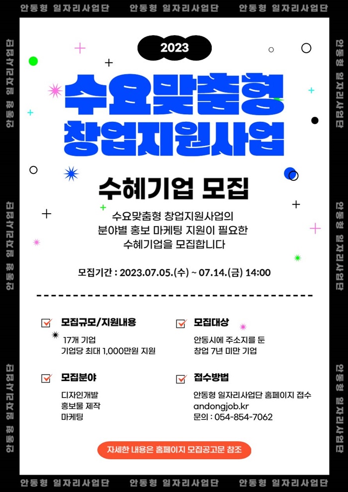 ½Åû Á¢¼ö´Â ¿Â¶óÀÎÀ¸·Î ÁøÇàµÇ¸ç, ¼¼ºÎ³»¿ëÀº »ç¾÷´Ü ´©¸®Áý(https://andongjob.kr/)¸¦ ÅëÇØ È®ÀÎÇÒ ¼ö ÀÖ´Ù. ¶ÇÇÑ, ¾Èµ¿Çü ÀÏÀÚ¸®»ç¾÷´Ü(¢Ï054-854-7062)À¸·Î ÀüÈ ¹®ÀÇÇÒ ¼ö ÀÖ´Ù.