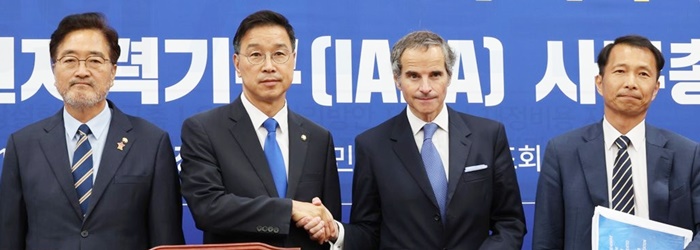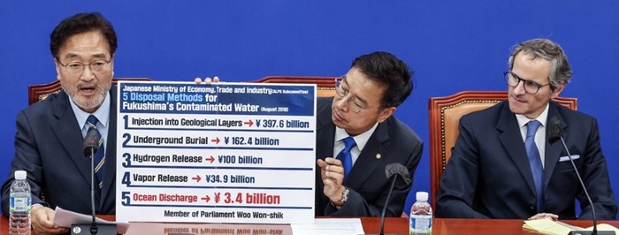 | À§¼º°ï ´õºÒ¾î¹ÎÁÖ´ç ÈÄÄí½Ã¸¶ ¿øÀü¿À¿°¼ö ÇØ¾çÅõ±âÀúÁö ´ëÃ¥À§¿øÈ¸ À§¿øÀå(¿ÞÂÊ µÎ¹øÂ°)°ú ¶óÆÄ¿¤ ±×·Î½Ã ±¹Á¦¿øÀڷ±ⱸ( IAEA) »ç¹«ÃÑÀå(¿ÞÂÊ ¼¼¹øÂ°)ÀÌ 9ÀÏ ¿ÀÀü ¼¿ï ¿©Àǵµ ±¹È¸¿¡¼ ¸é´ã¿¡ ¾Õ¼ ¾Ç¼öÇϰí ÀÖ´Ù. /°øµ¿ÃëÀç |