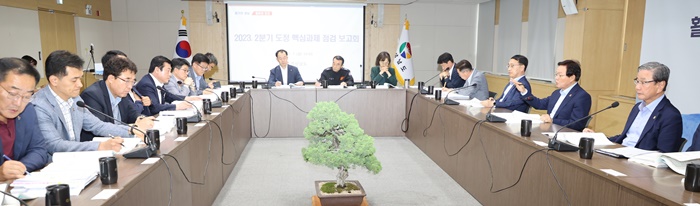 [½Ã»çÄÚ¸®¾ÆÀú³Î=Á¤Á¾¹Î ¼±ÀÓ±âÀÚ] ¹Ú¿Ï¼ö °æ³²µµÁö»ç´Â 7ÀÏ µµÃ» µµÁ¤È¸Àǽǿ¡¼ ‘2023³â 2ºÐ±â µµÁ¤ ÇٽɰúÁ¦ Á¡°Ëº¸°íȸ’¸¦ Á÷Á¢ ÁÖÀçÇØ °ø¾àÀ» Æ÷ÇÔÇÑ µµÁ¤Çö¾È ÀÌÇà»óȲÀ» Á¡°ËÇß´Ù.