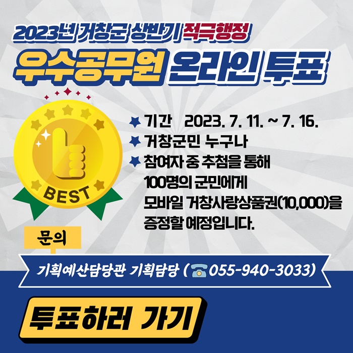 ¿Â¶óÀÎ ÅõÇ¥´Â ±ºÃ» ȨÆäÀÌÁö(geochang.go.kr)¿¡¼ ±º¹ÎÂü¿©-±º¹ÎÀÇ ¼Ò¸®-¼³¹®Á¶»ç Ç׸ñ¿¡¼ ‘2023³â »ó¹Ý±â Àû±ØÇàÁ¤ ¿ì¼ö°ø¹«¿ø ¼±Á¤ ±º¹ÎÅõÇ¥’¸¦ ¼±ÅÃÇÏ°í º»ÀÎ ÀÎÁõ ÈÄ Àû±ØÇàÁ¤ »ç·Ê 8°³ Áß 2°³¸¦ ¼±ÅÃÇÏ¸é µÈ´Ù.