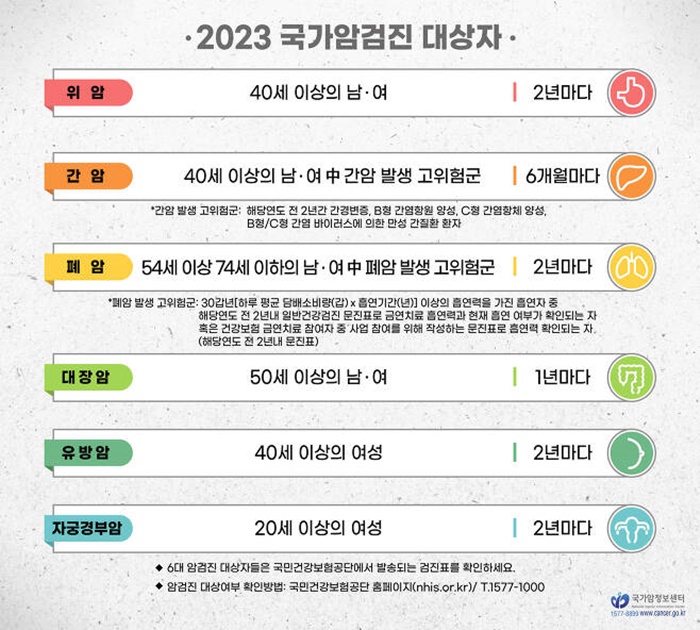 ¿ÃÇØ ±¹°¡ ¾Ï °ËÁø ´ë»óÀº Ȧ¼ö³âµµ Ãâ»ýÀÚ·Î ¡âÀ§¾Ï 40¼¼ ÀÌ»ó ³²³à ¡â°£¾Ï 40¼¼ ÀÌ»ó ³²³à Áß °£¾Ï ¹ß»ý °íÀ§Ç豺(6°³¿ù ÁÖ±â) ¡â´ëÀå¾Ï 50¼¼ ÀÌ»ó ³²³à(1³â ÁÖ±â) ¡âÀ¯¹æ¾Ï 40¼¼ ÀÌ»ó ¿©¼º ¡âÀڱðæºÎ¾Ï 20¼¼ ÀÌ»ó ¿©¼º ¡âÆó¾Ï 54~74¼¼ ³²³à Áß Æó¾Ï ¹ß»ý °íÀ§Ç豺ÀÌ´Ù.