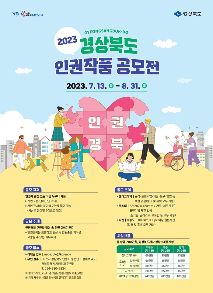 [½Ã»çÄÚ¸®¾ÆÀú³Î=±è¿¬ÇÐ ±âÀÚ] °æºÏµµ´Â Àαǿ¡ ´ëÇÑ °ü½É°ú Âü¿©¸¦ ÅëÇØ µµ¹ÎµéÀÇ À뱂 ÀǽÄÀ» ³ôÀ̰í Àαǰ¡Ä¡ÀÇ »çȸÀû È®»ê°ú ÀαÇÁ¸Áß ¹®È Á¤Âø¿¡ ±â¿©Çϱâ À§ÇÑ ‘2023³â °æ»óºÏµµ ÀαÇÀÛǰ °ø¸ðÀü’À» °³ÃÖÇÑ´Ù°í ¹àÇû´Ù.
