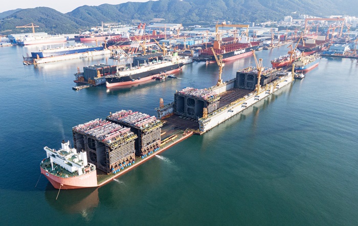 | ÀÚÇ×¼±¿¡ ½ÇÀº ºí·ÏÀ» °ÅÁ¦»ç¾÷Àå ³» ÇÃ·ÎÆÃµµÅ©(Floating Dock)·Î À̵¿ ½Ã۰í ÀÖ´Ù. /ÇÑÈ¿À¼Ç Á¦°ø |