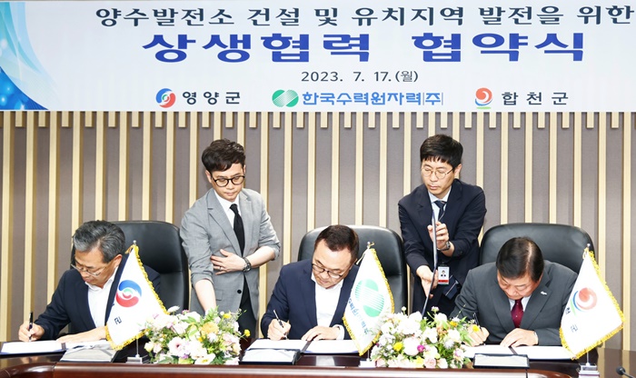| ¿ÀµµÃ¢ ¿µ¾ç±º¼ö(¿ÞÂÊ)¿Í ȲÁÖÈ£ Çѱ¹¼ö·Â¿øÀÚ·Â(ÁÖ) »çÀå(°¡¿îµ¥) ±èÀ±Ã¶ ÇÕõ±º¼ö(¿À¸¥ÂÊ)ÀÌ 17ÀÏ ¿ÀÈÄ ÇѼö¿ø º»»ç¿¡¼ ½Å±Ô ¾ç¼ö¹ßÀü¼Ò °Ç¼³ ¹× À¯Ä¡Áö¿ª ¹ßÀüÀ» À§ÇÑ »ó»ýÇù·Â Çù¾àÀ» ü°áÇÏ¸é¼ Çù¾à¼¿¡ ¼¸íÇϰí ÀÖ´Ù. |