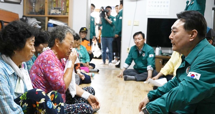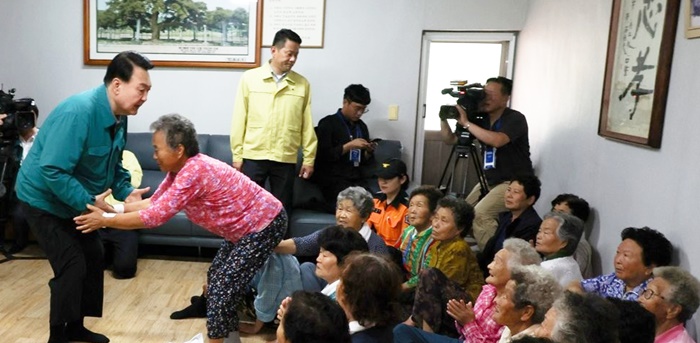 | À±¼®¿ ´ëÅë·ÉÀÌ 17ÀÏ °æºÏ ¿¹Ãµ±º °¨Ãµ¸é ¹ú¹æ¸® »ê»çÅ ÇÇÇØ ÇöÀåÀ» ã¾Æ ÀӽðÅÁֽü³·Î ¸¶·ÃµÈ ³ëÀÎȸ°ü¿¡¼ ÁֹεéÀ» ¸¸³ª°í ÀÖ´Ù. /´ëÅë·É½Ç Á¦°ø |