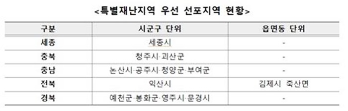 [½Ã»çÄÚ¸®¾ÆÀú³Î=Á¤Á¾¹Î ¼±ÀÓ±âÀÚ] À±¼®¿ ´ëÅë·ÉÀÌ 19ÀÏ ÁýÁßÈ£¿ì ÇÇÇØ°¡ ÄÇ´ø ¼¼Á¾½Ã, ÃæºÏ ûÁֽ÷±«»ê±º, Ãæ³² ³í»ê½Ã·°øÁֽ÷û¾ç±º·ºÎ¿©±º, ÀüºÏ ÀÍ»ê½Ã·±èÁ¦½Ã Á×»ê¸é, °æºÏ ¿¹Ãµ±º·ºÀȱº·¿µÁֽ÷¹®°æ½Ã µî 13°³ ÁöÀÚü¸¦ Ưº°Àç³Áö¿ªÀ¸·Î ¿ì¼± ¼±Æ÷Çß´Ù.