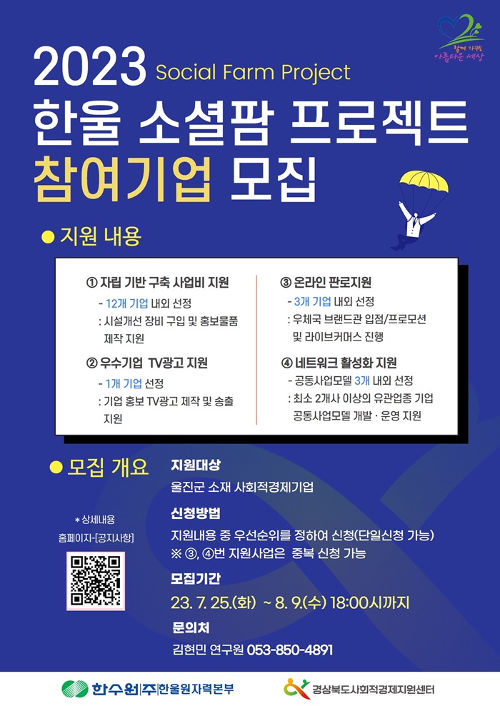 ÇÑ¿ï ¼Ò¼ÈÆÊ ÇÁ·ÎÁ§Æ® ¸ðÁý ½Åû ±â°£Àº 25ÀϺÎÅÍ 8¿ù 9ÀϱîÁö´Ù. Áö¿øÀ» Èñ¸ÁÇÏ´Â ¿ïÁø±º ³» »çȸÀû°æÁ¦ ±â¾÷Àº °æ»óºÏµµ »çȸÀû°æÁ¦Áö¿ø¼¾ÅÍ È¨ÆäÀÌÁö(www.gbse.or.kr), ÇѿﺻºÎ ȨÆäÀÌÁö(www.khnp.co.kr/hanul/main.office), ¶Ç´Â ¿ïÁø±ºÃ» ȨÆäÀÌÁö(www.uljin.go.kr/lndex.uljin)¸¦ ÅëÇØ ÀÚ¼¼ÇÑ ³»¿ëÀ» È®ÀÎÇÒ ¼ö ÀÖ´Ù.