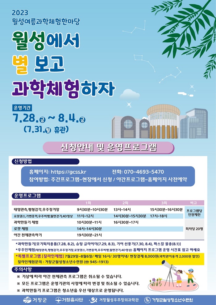 ¹«´õ¿î ¿©¸§ Àç¹ÌÀÖ´Â °úÇÐüÇè°ú ûÁ¤ÇÑ ¹ãÇϴÿ¡¼ ¾Æ¸§´Ù¿î º°À» º¸´Â Ãß¾ïÀ» ¸¸µé ¼ö ÀÖ´Â ÁÁÀº ±âȸ·Î, ÇÁ·Î±×·¥ Âü¿© µî ±âŸ ÀÚ¼¼ÇÑ »çÇ×Àº °Åâ¿ù¼º¿ìÁÖâÀǰúÇаü(070-4693-5470)À¸·Î ¹®ÀÇÇÏ¸é µÈ´Ù.