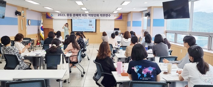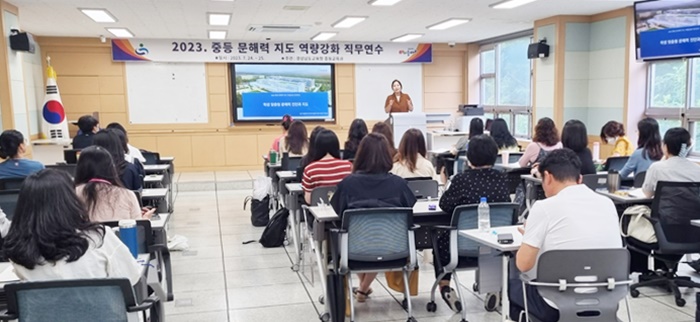 [½Ã»çÄÚ¸®¾ÆÀú³Î=Á¤Á¾¹Î ¼±ÀÓ±âÀÚ] °æ³²µµ±³À°Ã»(±³À°°¨ ¹ÚÁ¾ÈÆ)Àº 24ÀÏ~25ÀÏ °æ»ó³²µµ±³À°Ã» ±³À°Á¤º¸¿ø¿¡¼ Áßµî ±³¿ø 56¸íÀ» ´ë»óÀ¸·Î ‘Áßµî ¹®ÇØ·Â Áöµµ ¿ª·® °È Á÷¹« ¿¬¼ö’¸¦ ¿¾ú´Ù.
