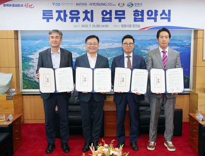 | â¿øÆ¯·Ê½Ã´Â 25ÀÏ ½Ãû Á¢°ß½Ç¿¡¼ ¿µÃ¢ÀÌ¿£Áö(ÁÖ), (ÁÖ)ŰÇÁÄÚÀüÀÚÇ×°ø, È¿¼ºÁß°ø¾÷(ÁÖ)¿Í ÅõÀÚ±Ý¾× 318.5¾ï ¿ø ¹× »ó½Ã°í¿ë 112¸í ±Ô¸ðÀÇ ÅõÀÚÇù¾àÀ» ü°áÇß´Ù. »çÁø ¿ÞÂʺÎÅÍ ±èÁøÈ£ È¿¼ºÁß°ø¾÷ â¿ø°øÀåÀå , È«³²Ç¥ â¿ø½ÃÀå, Á¤°æ¾È ŰÇÁÄÚÀüÀÚÇ×°ø ´ëÇ¥ÀÌ»ç, ÀÌ»ó¿µ ¿µÃ¢ÀÌ¿£Áö ´ëÇ¥ÀÌ»ç). |