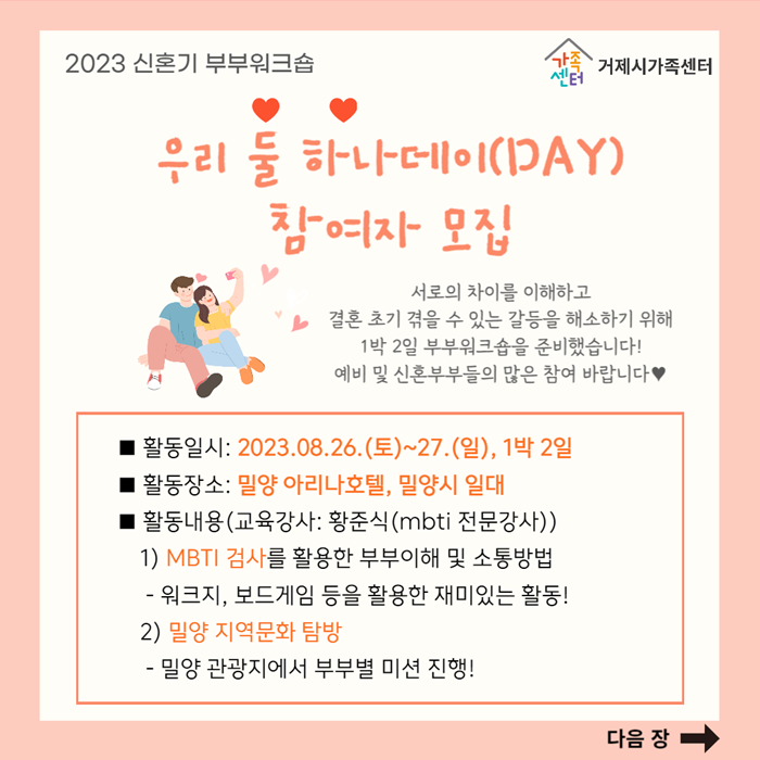 ½ÅÈ¥±â ºÎºÎ¿öÅ©¼óÀº ºÎºÎ°¡ °áÈ¥ Ãʱ⠰ÞÀ» ¼ö ÀÖ´Â °¥µîÀ» ÇØ¼ÒÇÏ°í ¼·ÎÀÇ Â÷ÀÌ¿¡ ´ëÇÑ ÀÌÇØ¸¦ ÅëÇØ ÇູÇÑ °áÈ¥»ýȰ À¯Áö ¹× °Ç°ÇÑ °¡Á¤ ¸¸µé±â¸¦ µ½°íÀÚ ¸¶·ÃÇÏ¿´À¸¸ç, 8¿ù 26ÀϺÎÅÍ 27ÀϱîÁö 1¹Ú 2Àϰ£ ¹Ð¾ç ¾Æ¸®³ªÈ£ÅÚ¿¡¼ ÁøÇàµÉ ¿¹Á¤ÀÌ´Ù.